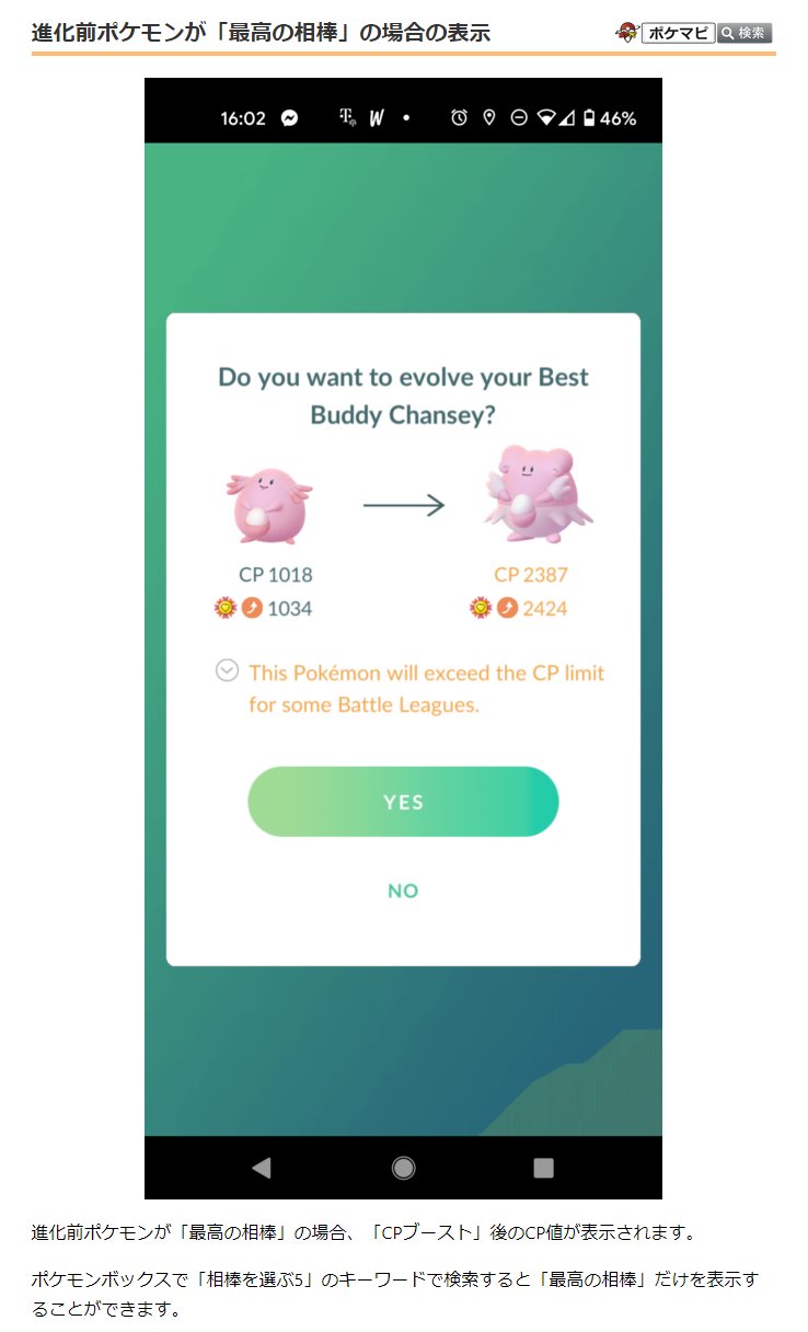 ポケモンgo攻略情報 ポケマピ 進化前ポケモンが 最高の相棒 の場合は Cpブースト 後のcp値 等が表示されます ポケモンボックスで 相棒を選ぶ5 のキーワードで検索すると 最高の相棒 だけを表示することができます ポケモンgo T